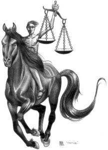 «(5) quand il ouvrit le troisième sceau, j’entendis le troisième être vivant qui disait: Viens. Je regardai, et voici, parut un cheval noir. Celui qui le montait tenait une balance dans sa main. (6) Et j’entendis au milieu des quatre êtres vivants une voix qui disait: une mesure de blé pour un denier, et trois mesures d’orge pour un denier; mais ne fais point de mal à l’huile et au vin. »